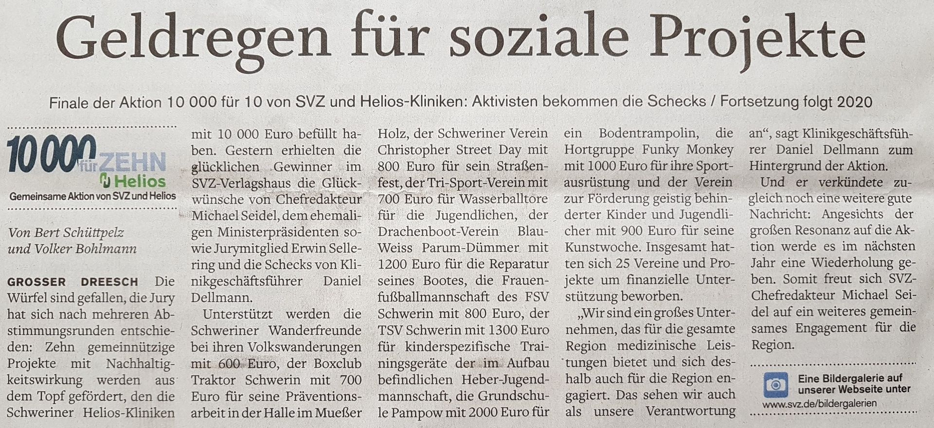 Mit Herrn Dellmann, seines Zeichens Geschäftsführer der Helios Kliniken in Schwerin, machte ein neuer Spender der Abteilung Gewichtheben seine Aufwartung. Vor Wochenfrist übergab er einen Spendencheck mit 1300 € für die Anschaffung einer neuen Kinderhantel. Mit den Mitteln aus der Aktion „Zehntausend für zehn“ wurde die Hantel bereits gekauft und im offenen Training eingesetzt.
