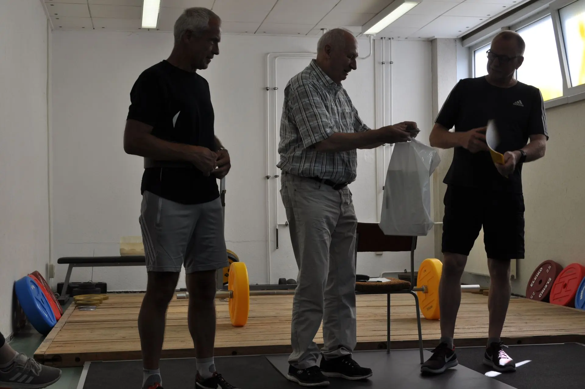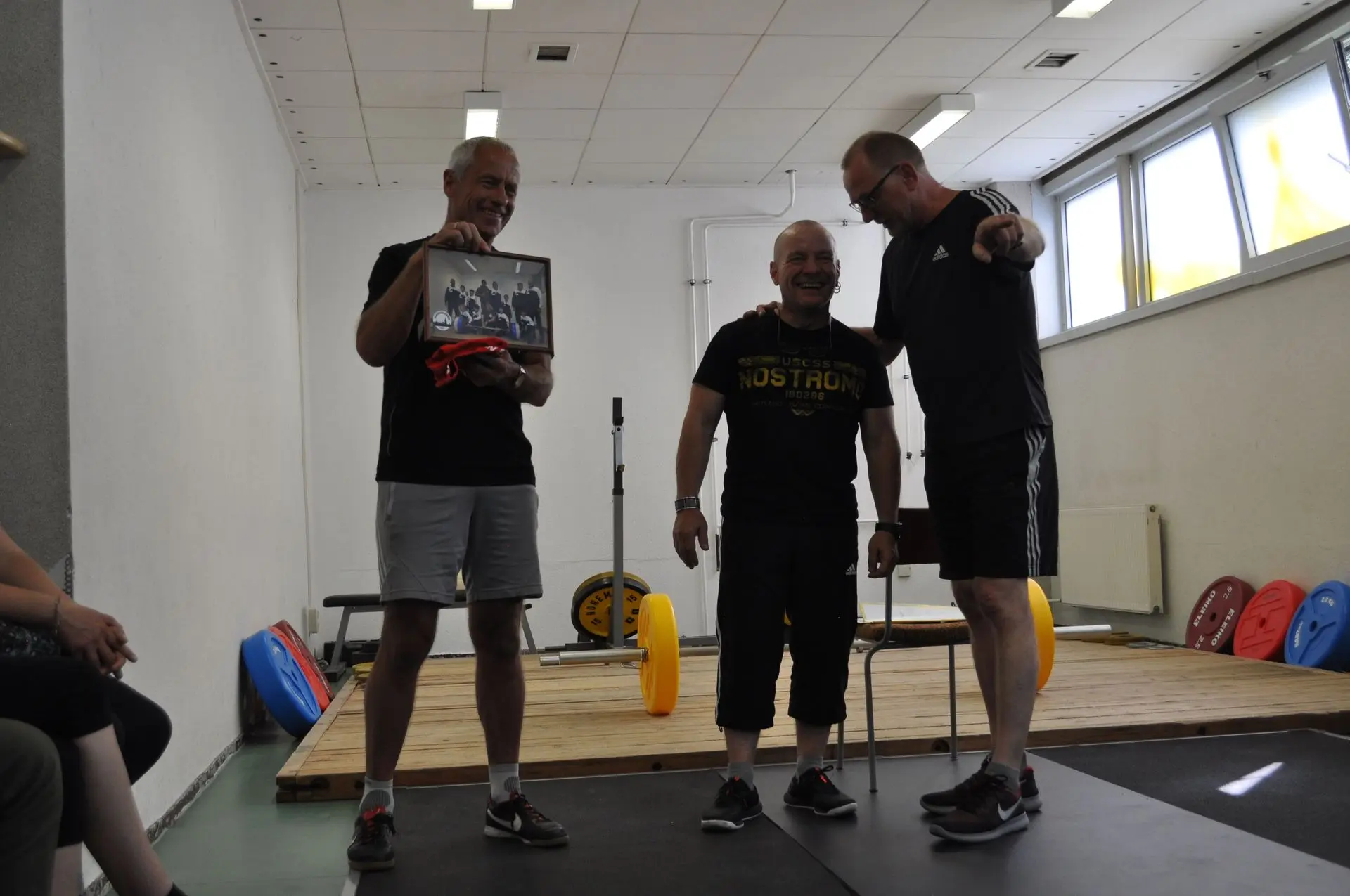 Als Ehrengast kam Walter Thiel, Gründungsvater des Gewichthebens in Schwerin. Er gab einen kurzen Einblick in die „alten und erfolgreichen Zeiten“ mit Beginn 1971 und sorgte für ein Raunen, als er damalige Heberutensilien zeigte und diese zur weiteren Aufbewahrung an die „Jungs“ übergab. Walter und seine Frau Christel sind weiterhin sehr mit dem Gewichtheben verbunden. So spendeten sie 300 € für die Kinderabteilung.